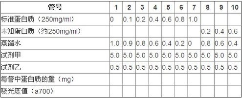 取1毫升样品溶液(其中约含蛋白质20~250微克),按上述方法进行操作,取1毫升蒸馏水代替样品作为空白对照。通常样品的测定也可与标准曲线的测定放在一起,同时进行。即在标准曲线测定的各试管后面,再增加3个试管。如上表中的8、9、10试管。