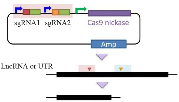图注:针对想要敲除的非编码基因或区域两头设计特异性 sgRNA 序列,靶向切除整段非编码区域,以达到非编码基因敲除的目的