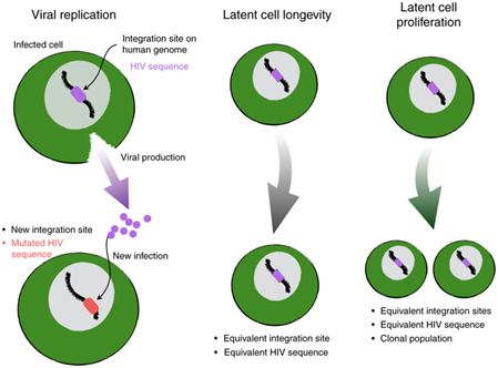 当HIV感染健康细胞时,它会将它自己的DNA插入到人类染色体中,从而留下独特的遗传特征。这些研究人员指出,如果这种病毒复制本身是潜伏性HIV病毒库存在的原因,那么这种遗传特征将包括独特的整合位点和受感染细胞的DNA存在的不同突变。事实上,他们发现大多数遗传特征是相同的,这表明HIV病毒库中的持久存在是正常的CD4+ T细胞有丝分裂的产物。为了维持稳定的细胞群体并对外来抗原作出反应,CD4+ T细胞通常每隔几个月就会发生增殖。每当这个正常的过程发生时,HIV DNA与人类DNA一起被复制到子细胞中。