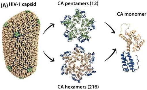 HIV衣壳是由不同形状的蛋白组成的锥形外壳。它是由衣壳蛋白(CA)形成的大约200个具有6个边的六聚体和12个具有5个边的五聚体所构成。这些衣壳蛋白六聚体和五聚体组合在一起,形成一个外壳,包围并保护HIV病毒,直到这种病毒能够感染健康细胞。如果这种衣壳结构过早地裂解,那么这种感染就不会发生。