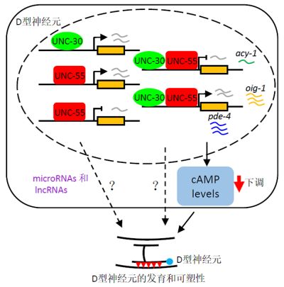 该研究揭示这两个转录因子各自均调控2000多个基因(秀丽线虫约有2万个基因)的表达,它们共同调控1300多个编码和非编码基因的表达。这些靶基因在对神经元发育和可塑性具有重要调控作用的多个信号通路中行使功能。其中一个通路是决定环腺苷酸(cAMP)浓度的cAMP代谢通路。为了直接观测活体秀丽线虫细胞中的cAMP浓度变化,研究人员开创性地将用于哺乳动物细胞中检测cAMP水平的探针改造为在活体秀丽线虫中也可以使用工具。进一步的研究揭示,这两个在动物界高度保守的转录因子通过调节神经元中的基因表达,调控了细胞中cAMP的浓度,进而在时间上影响D型运动神经元发育和可塑性的进程。此外,UNC-30和UNC-55是从秀丽线虫到人均具有的高度保守的转录因子,从全基因组水平上获得了UNC-30和UNC-55调控的靶基因,为进一步探索动物细胞中转录因子调控网络提供了重要基础。
