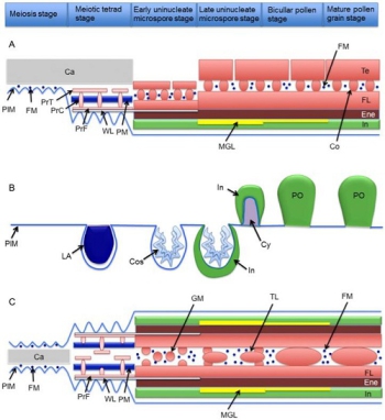 花粉是种子植物的雄配子体,在花药的发育过程中由花粉母细胞经过减数分裂产生、发育而成。花粉的形态学特征为植物分类、系统演化研究提供微观形态学资料,也为探讨古植被、古气候和古地理等提供参考。在被子植物花粉演化历程中,花粉分散单位的演化趋势为由单粒到四合花粉再到多合花粉。目前,单花粉——四合花粉演化方面的分子机制尚不清楚。