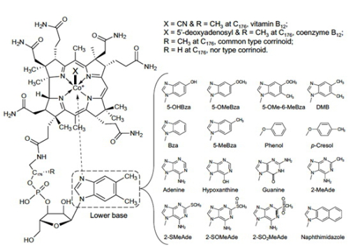 以维生素B12为代表的钴胺素家族(Corrinoid)是自然界中产生的最复杂的一类非聚合生物大分子。作为很多功能蛋白所必需的辅酶因子,钴胺素对维持细胞的基础生理生化代谢活动(例如脱氧核糖核酸合成、甲硫氨酸合成)至关重要。钴胺素家族的化合物分子复杂,然而结构域相对保守,维生素B12以及其它的钴胺素类似物在结构上的差异取决于其低位配合物(Lower base)的结构。已知的天然钴胺素类似物有多达16种不同的低位配合物结构,然而,对钴胺素类似物的结构上的多样性与其在生物学功能上的相关性关注甚少。