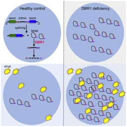 这些研究人员发现一个被称作DBR1的基因发生突变,该基因产生的一种蛋白在mRNA剪接期间有助于处理mRNA中形成的环状结构。没有这种蛋白,对病毒的免疫力会在脑干中受到选择性削弱。Casanova的实验表明DBR1几乎完全丧失是这7名儿童患者的脑干遭受病毒入侵的罪魁祸首。这些发现也揭示出mRNA加工机制与大脑特定区域的保护性免疫之间存在着意外之外的关联性。